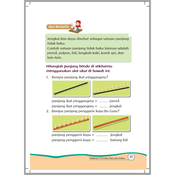 Pengukuran dengan satuan tidak baku adalah satuan yang menghasilkan nilai ukuran yang. Pada era modern ini, kalian juga bisa melakukan eksperimen dengan satuan ini untuk mengukur panjang meja kalian, lho. ➢ mendemonstrasikan cara mengukur panjang benda dengan satuan tak baku, jengkal, hasta, depa, telapak kaki, langkah. Contoh satuan tak baku : Satuan panjang tidak baku seperti yang ditunjukan oleh gambar diatas disebut. A) jengkal adalah pengukuran yang . Maupun tulisan dalam bentuk tabel, grafik, bagan, dan gambar yang relevan. Depa, gayung, cangkir, sloki, kaleng, dan lainnya. Mikrometer sekrup (pada gambar menunjukkan nilai 10,00 mm). Contoh satuan tidak baku adalah. Tuliskan 5 contoh satuan baku dan 5 contoh satuan tidak baku dalam kehidupan . Jengkal telapak kaki, lengan, hasta, ataupun depa. Pengukuran tak baku (jengkal, hasta, depa).